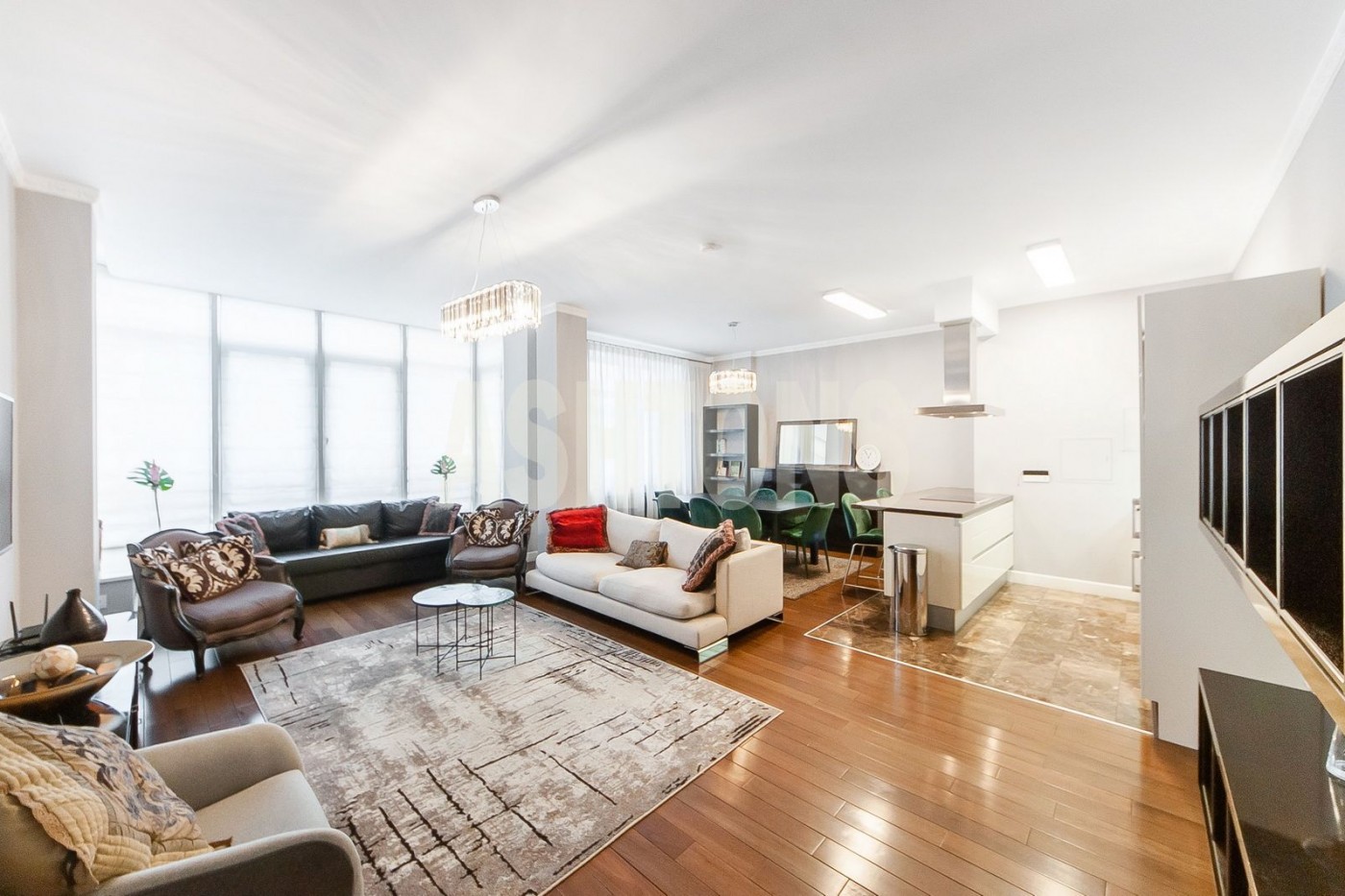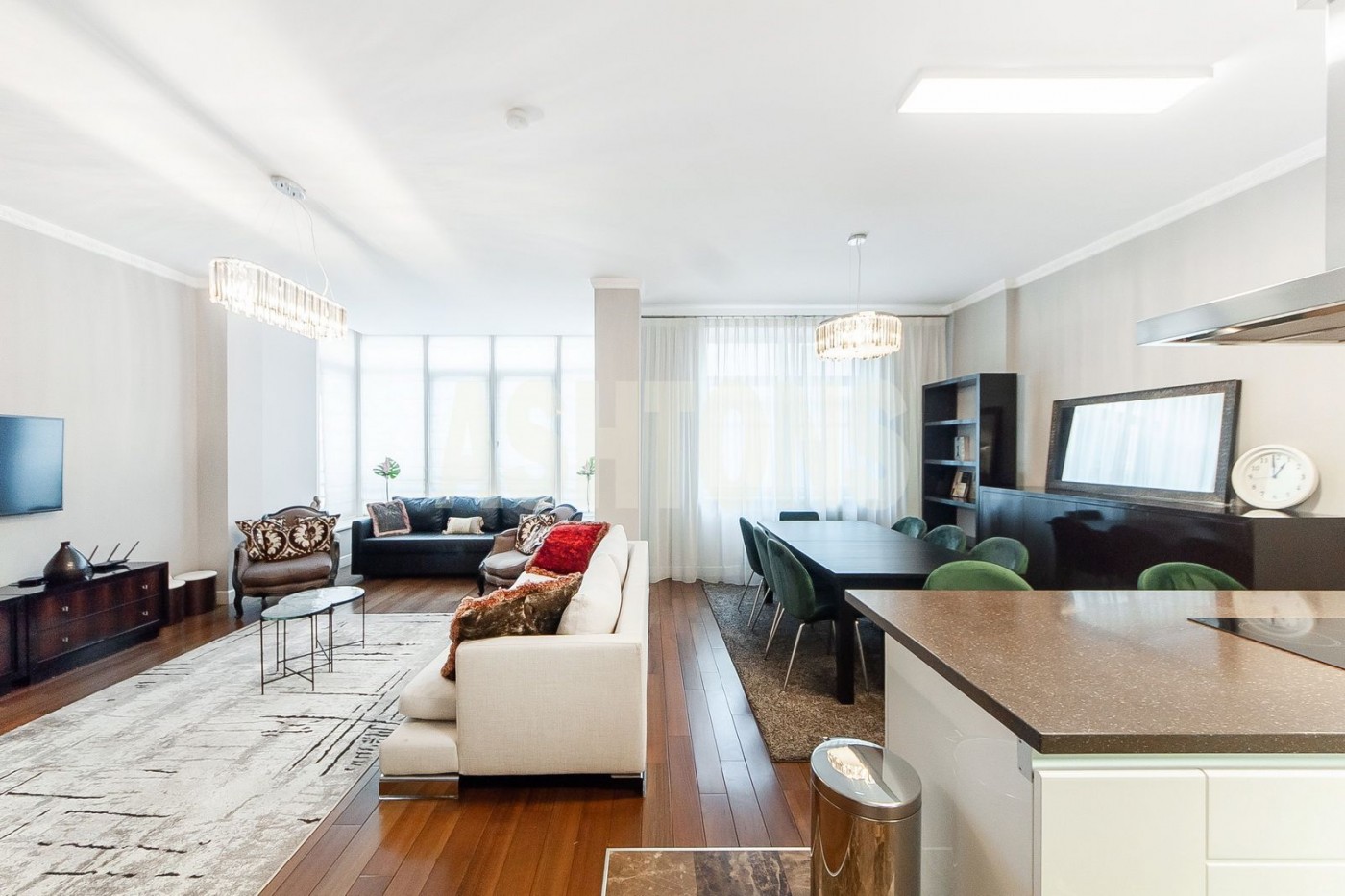Functional layout: kitchen-dining room-living room, bedroom, free-use room (children's, guest bedroom), 1.5 combined bathrooms, laundry room, hall with a wardrobe block. Lots of storage space. 2 dressing rooms. Designer finishing is done using natural wood and stone, the light interior is decorated with designer chandeliers. Panoramic windows, thanks to which the apartment is full of light. The windows overlook the alley.