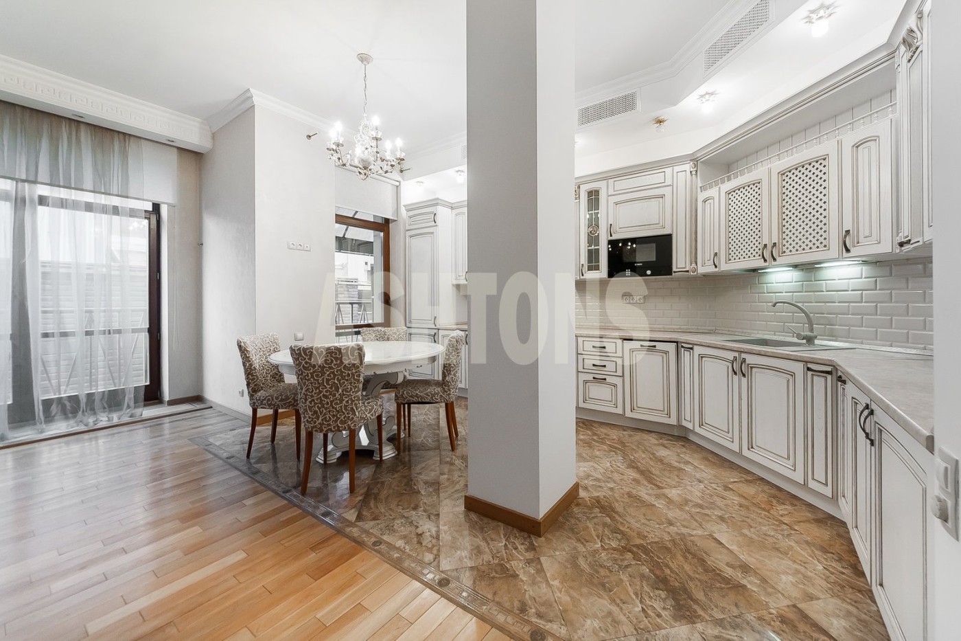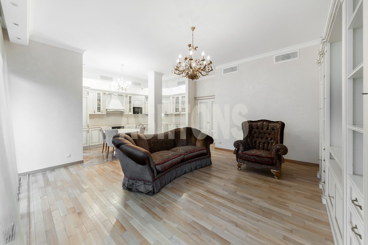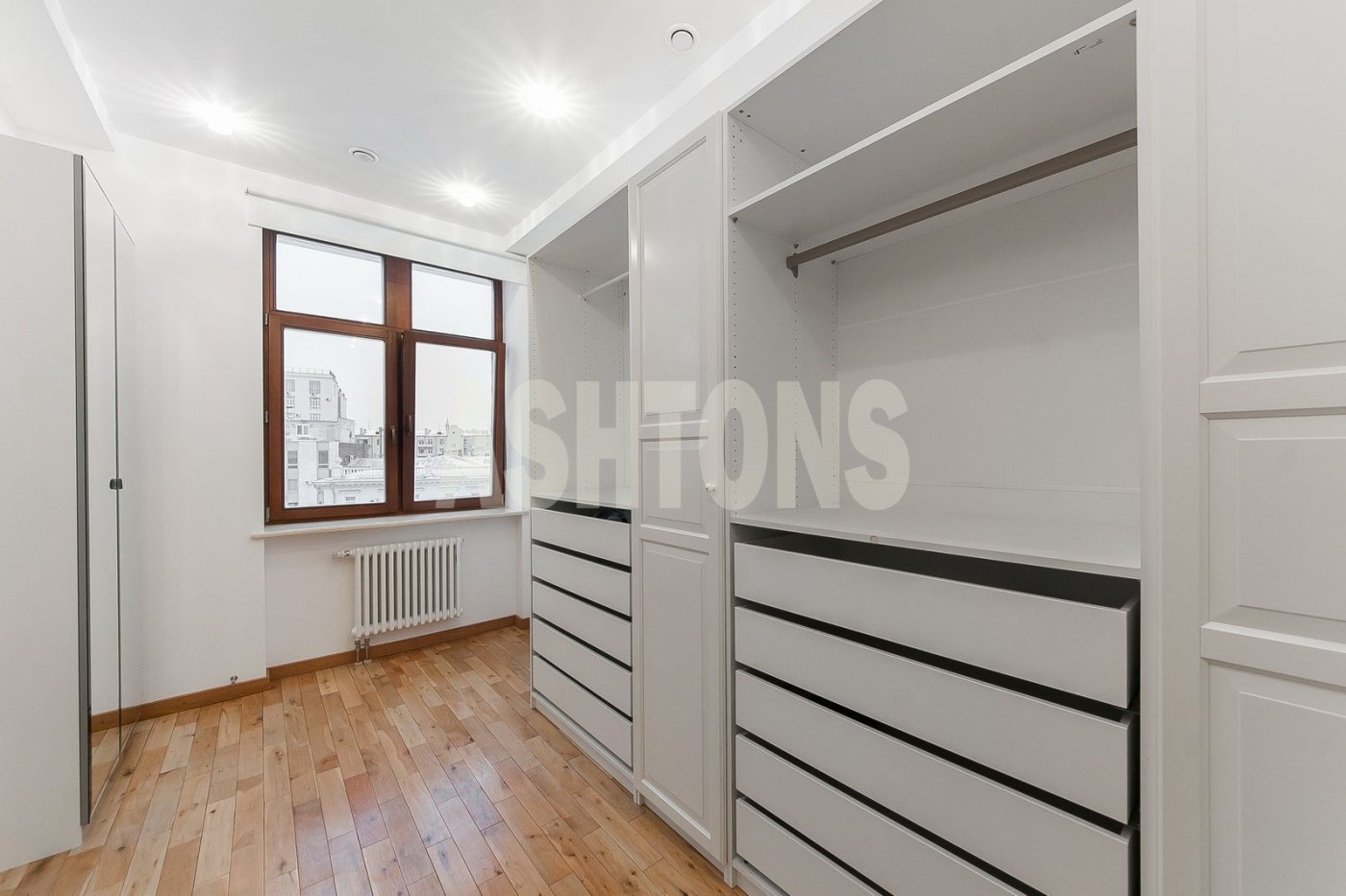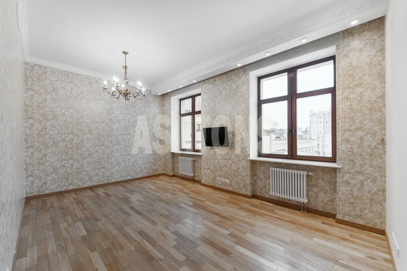 Functional layout: kitchen-living room, second bedroom with walk-in closets, two bathrooms with a jacuzzi and shower, loggia, and hallway. The apartment is FURNISHED (bedroom and study furniture included), and the option to remove or purchase additional furniture is negotiable. Expensive renovation using natural materials. The built-in kitchen is equipped with all appliances from leading global manufacturers. The windows face away from Tverskoy Boulevard. One parking space is available in the underground parking garage.