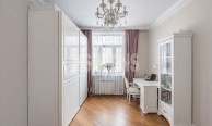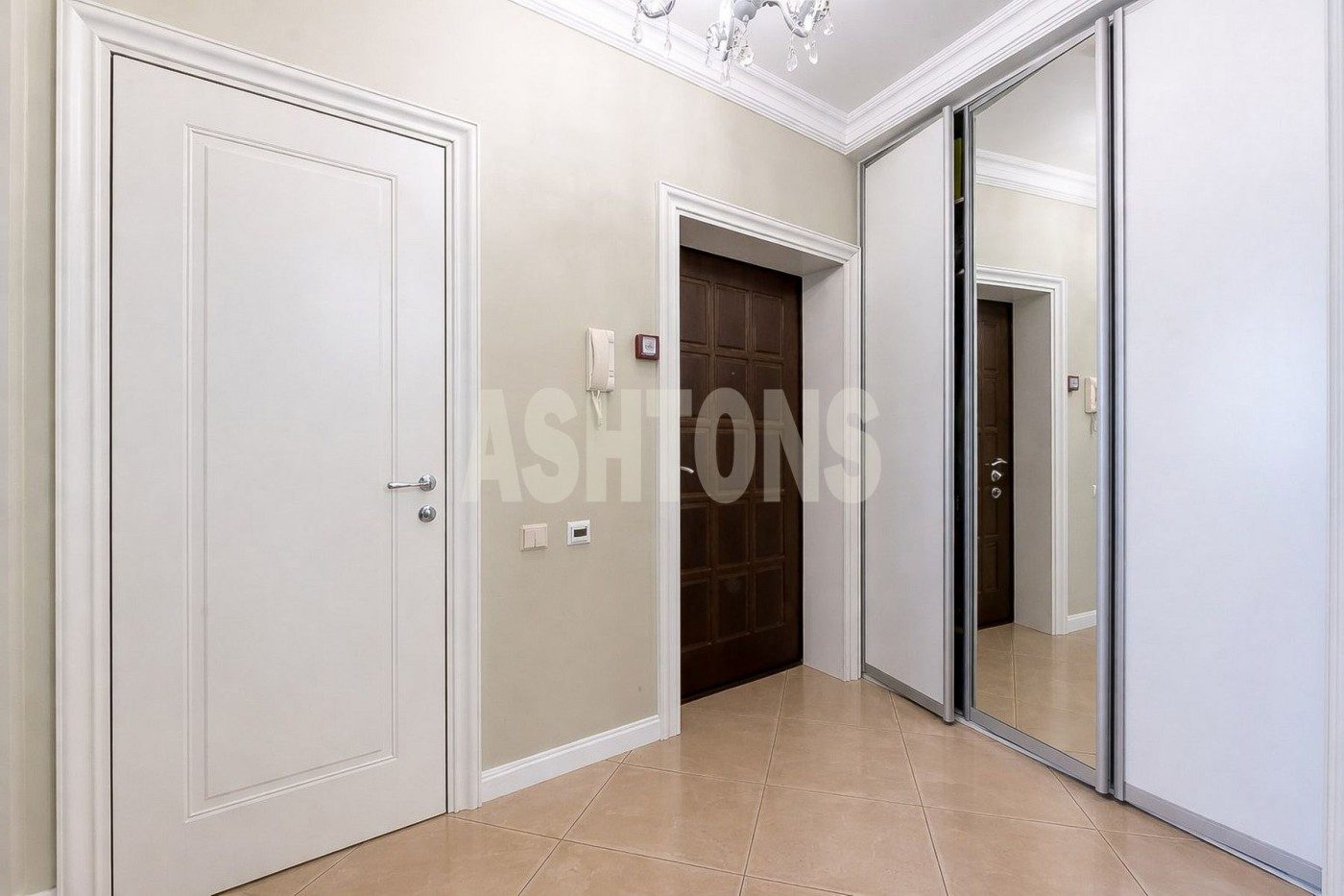 The apartment features a functional layout: a spacious kitchen, living room, master bedroom with access to a balcony and walk-in closet, children's room, walk-in closet in the hallway, and a guest bathroom. The apartment is very bright and fully furnished. Modern renovations are available.