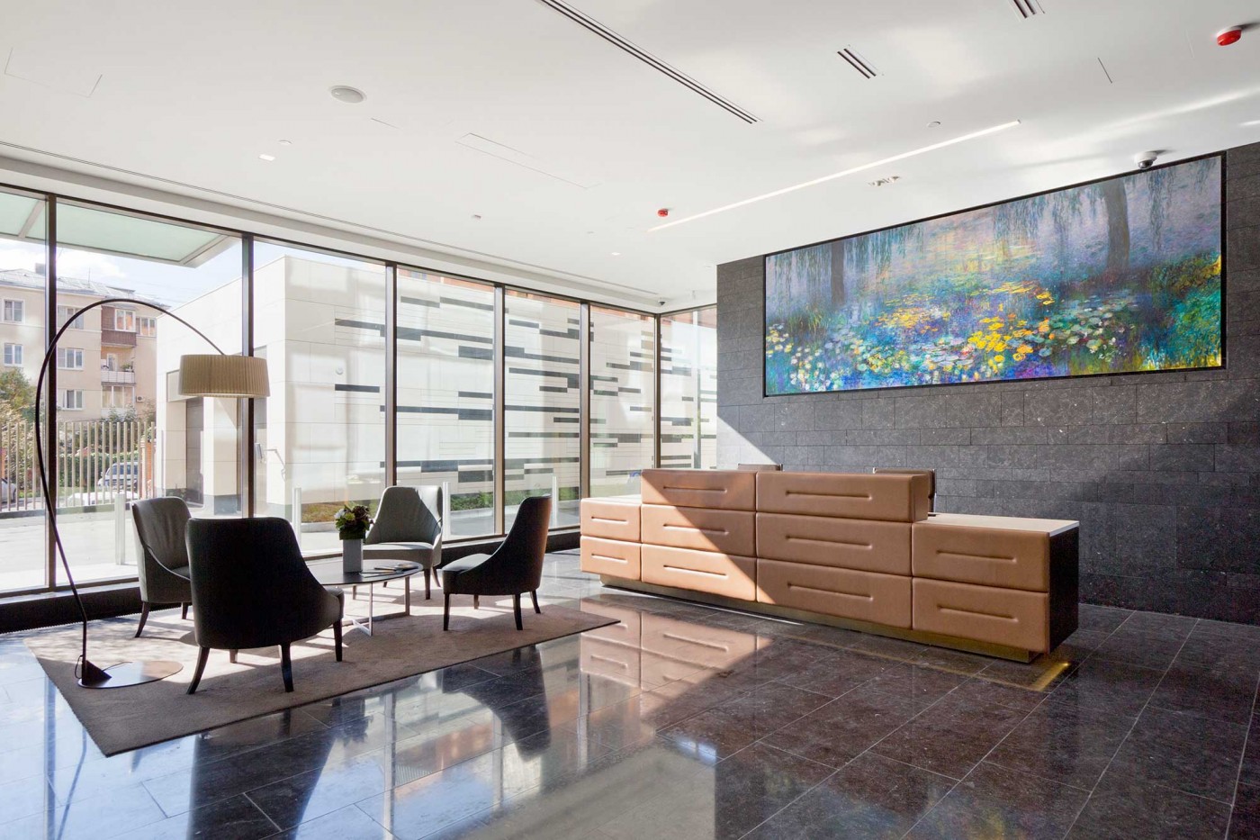 Уютное лобби с удобными местами для отдыха и общения. Высота потолка 7 м, сквозной проход